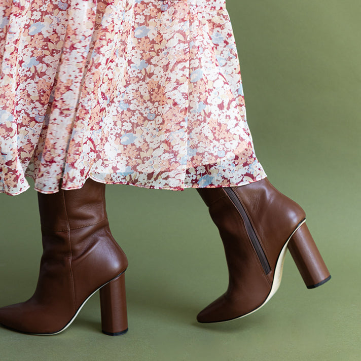 La bota Celina fue lo que imaginamos como la bota alta definitiva. Soñábamos con cuero suave, tonos marrones, una hermosa punta y un tacón grueso, ¡y lo logramos! No nos decidíamos entre estos dos colores, así que decidimos hacer ambos. Sin duda, estas son las botas que querrás tener en tu armario. Nos encantan con jeans metidos por dentro, vestidos y nuestra favorita: una falda midi. Un clásico de todos los tiempos.